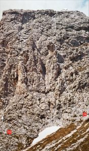 Discesa : raggiunta la cima seguire la cresta (direzione N) sul versante E (traccia di sentiero) scendendo fino alla sella tra Roda del Diavolo e Croz di Santa Giuliana (I-II, sarebbe la via normale alla Roda del Diavolo, 30 min). Ora seguire a destra il sentiero marcato (sud-est, nel catino sotto il Croz) e al bivio scendere a sinistra (E) nella spaccatura (tratto attrezzato), Quindi per il sentiero al rifugio Roda di Vael. ore 1.10.